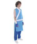 Crafted from synthetic materials, the costume features a flowing blue and white robe with intricate designs, inspired by the water tribe's traditional clothing. The robe is complete with matching blue pants, and gloves, adding a touch of elegance to the costume.
