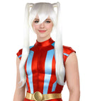 Made of synthetic fiber, this flame-retardant white wig with double ponytail style is perfect for both adults and kids alike. Made with an adjustable lining that can be stretched up to 22 inches in diameter to fit adults and kids above 5.