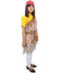This one-shoulder tunic features a realistic tribal animal print pattern in earthy tones, giving it an authentic and bold cave women appearance. The tattered hemline and asymmetrical cut reinforce the primitive vibe, while the included brown faux-leather belt completes the rugged look.