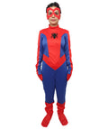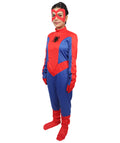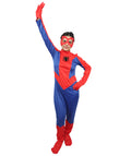 The outfit is shaped to maintain a sleek costume profile while still allowing comfortable movement during walking and light presentation use. Its web-print pattern and contrasting colours support a dynamic character presence without referencing specific licensed figures, making it suitable for creative costume occasions and themed role environments.