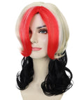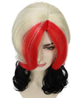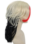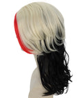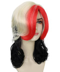 Inspired by bold fashion and stylized character looks, this synthetic wig features shoulder-length hair with vivid red, blonde, and black color blends, creating a dramatic, attention-grabbing appearance.