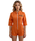 Designed for women who want to turn heads, this outfit is both playful and edgy. The orange inmate costume features a front zipper closure, giving you control over the style and fit—from zipped up for modesty to slightly open for a more daring look.