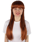 Elevate your upcoming costume game with this stunning Adult Women's Auburn Brown Long Straight Wig with braid and make a long-lasting impression. It is a long blonde wig with an attractive design. A beautiful round braid increases the beauty of the back part with some long, thin horizontal braid. Our Straight Wig is voluminous and makes a dramatic look with its bangs on the front. This wig is appropriate for any magical dress; it will complement your overall outfit.