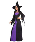 HPO Adult Women's Classic Witch Black and Purple Costume | Layered Dress with Pointed Hat and Waist Belt | Classic Witch Outfit for Halloween Costume Roleplay & Themed Events