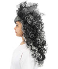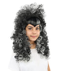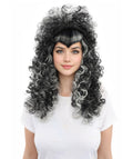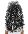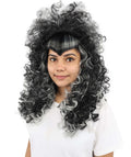 The Deluxe Vampire Mistress Curly Wig showcases a rich black base accented by sharp white highlights, delivering high-contrast drama that enhances facial features and costume detail. The layered curls flow with elegant movement, adding texture and dimension that photograph beautifully and captivate from every angle. Whether under candlelight or stage lighting, the color interplay amplifies its haunting appeal.