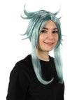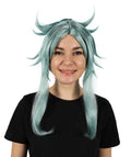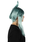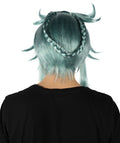 It is a Blue Wig with a unique hairstyle. Straight long hair on two sides and a round braid in the back middle make this Blue Wig sophisticated. Adding a style that looks like two horns represents something spiritual.