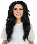 HPO Adult Women's Vintage-Inspired Quirky Chic Wavy Black Wig for Delores, Spooky Spectacle Edition | Halloween and Cosplay Wig | Flame-retardant Synthetic Fiber