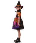 This costume showcases a layered witch dress with dramatic sleeves, a coordinating belt for a defined fit, and a classic pointed hat to complete the spellbinding silhouette. Crafted from durable synthetic fabric, the design offers comfort, shape retention, and freedom of movement for hours of wear.